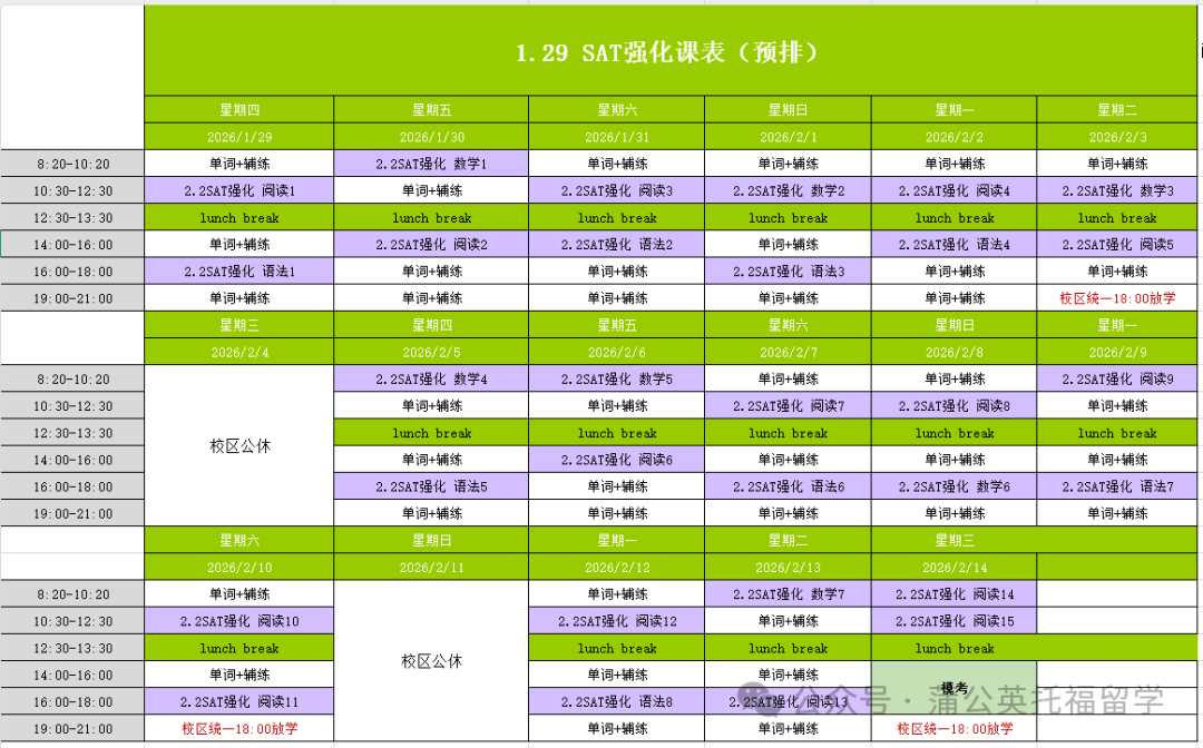 蒲公英班课一:年前SAT强化班课表
