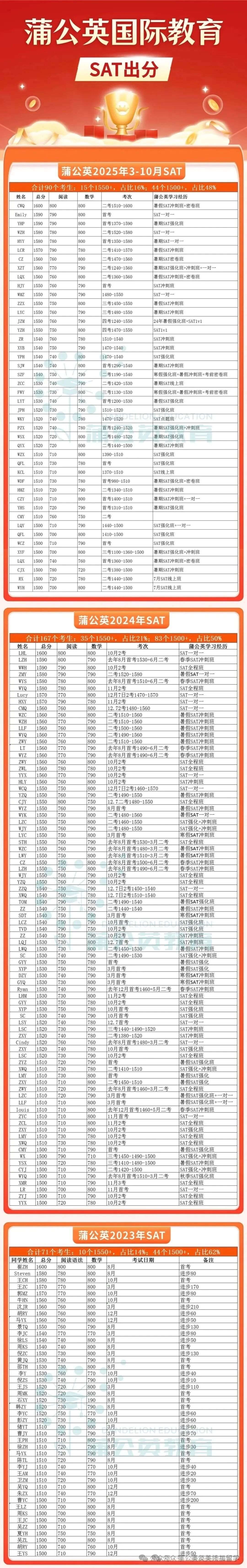 2025年9月SAT考试中,9月蒲公英SAT学员:SAT出分【1550】,上外金同学从1510-1550;SAT出分【1540】,七德沈同学从1380-1540进步160分;SAT出分【1530】,天一冯同学考前短冲班从1380-1530......