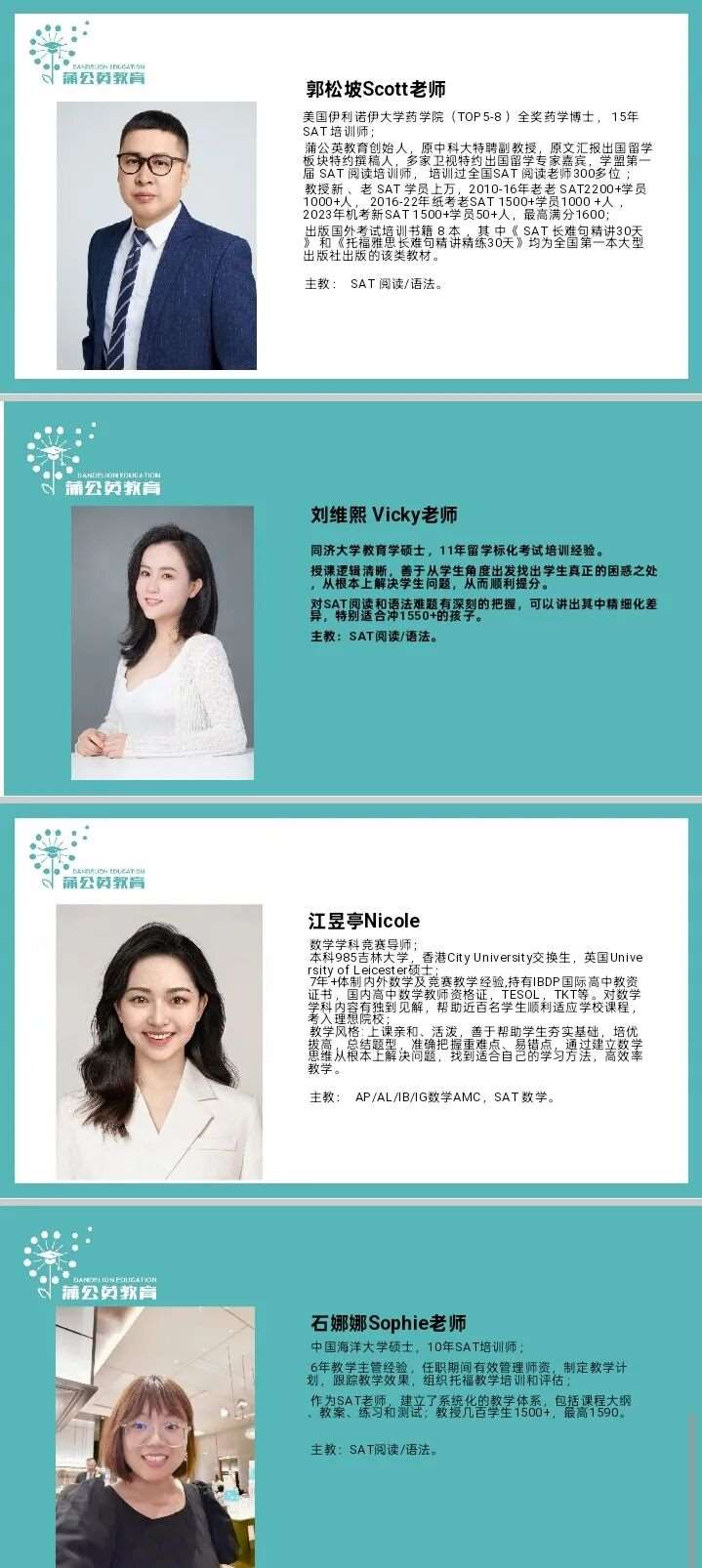 上海蒲公英教育拥有一支经验丰富、专业过硬的 SAT 师资团队。老师们毕业于国内外知名院校,对 SAT 考试有着深入的研究和丰富的教学经验。