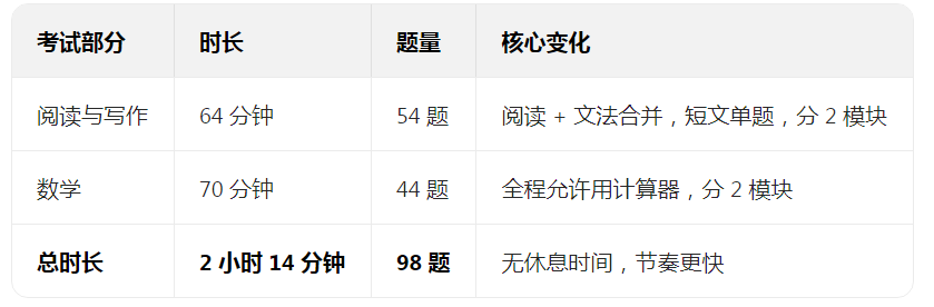 不再分“阅读”“文法”独立部分,合并为一个板块,64分钟内完成2个模块。
