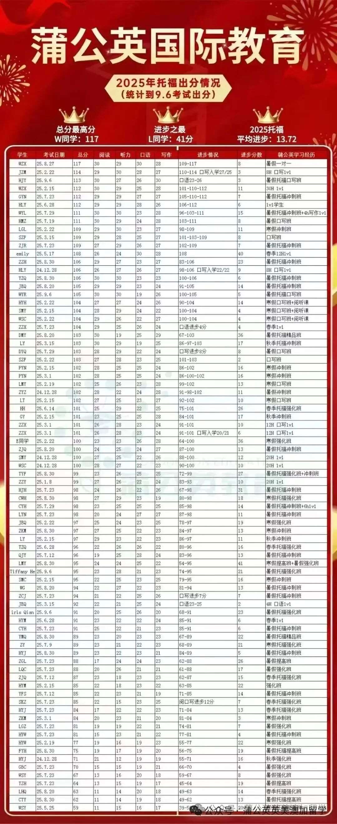 上海蒲公英出分:托福一个全程班平均进步10-15分。例如去年寒假21个托福100+的孩子,口语25+的8个,占比30%+; 写作15个25+,占比70%。【上海托福线下培训班
