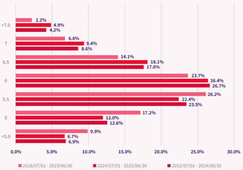 6分以上考生近六成,梯队稳定性较高; 6.5分以上占30.4%; 7分高分段占比略有减小; 5.5分以下低分段占比上升。
