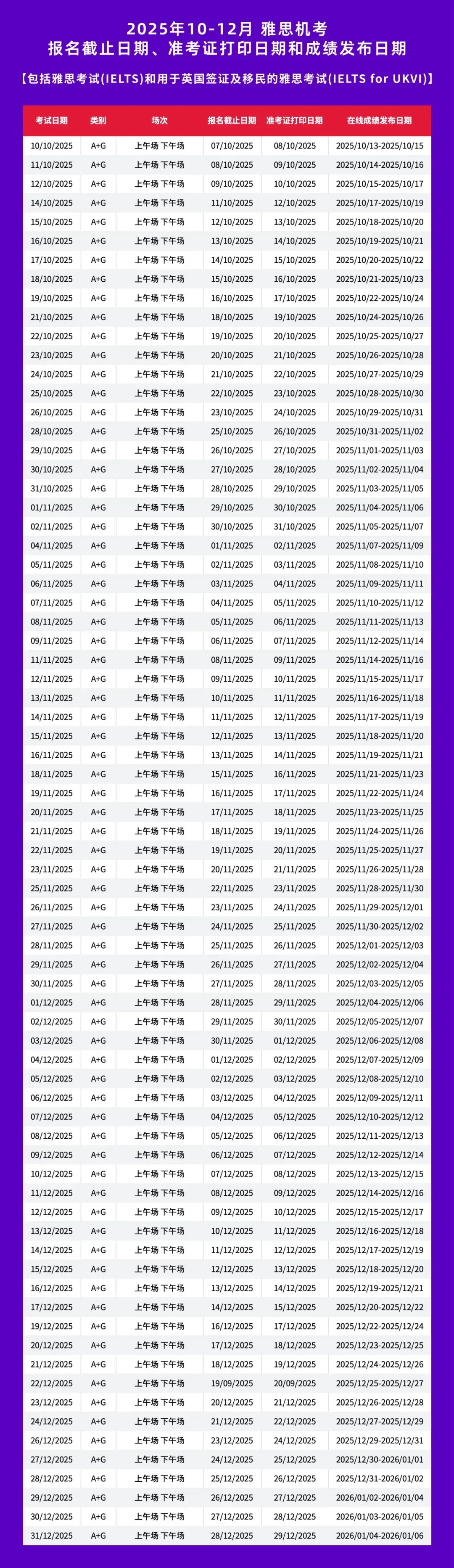 以上是对“速存!2025年11-12月雅思考试时间表汇总!含A/G类截止日期+完整报名攻略!”内容的解读。