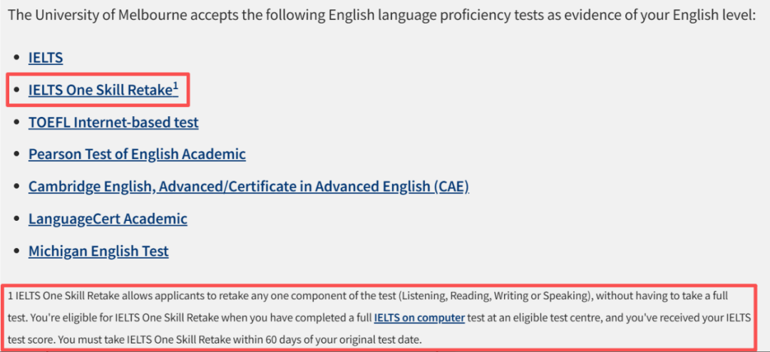 ✅ 墨尔本大学官网正式官宣:全面接受雅思单科重考(One Skill Retake),标志着澳洲八大学校已全员认可雅思单科重考*!