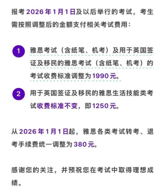 💥首降!时隔36年雅思考试降价!雅思官方官宣:2026 年 1 月 1 日起费用大调整,且1-3 月考位已开放抢座!