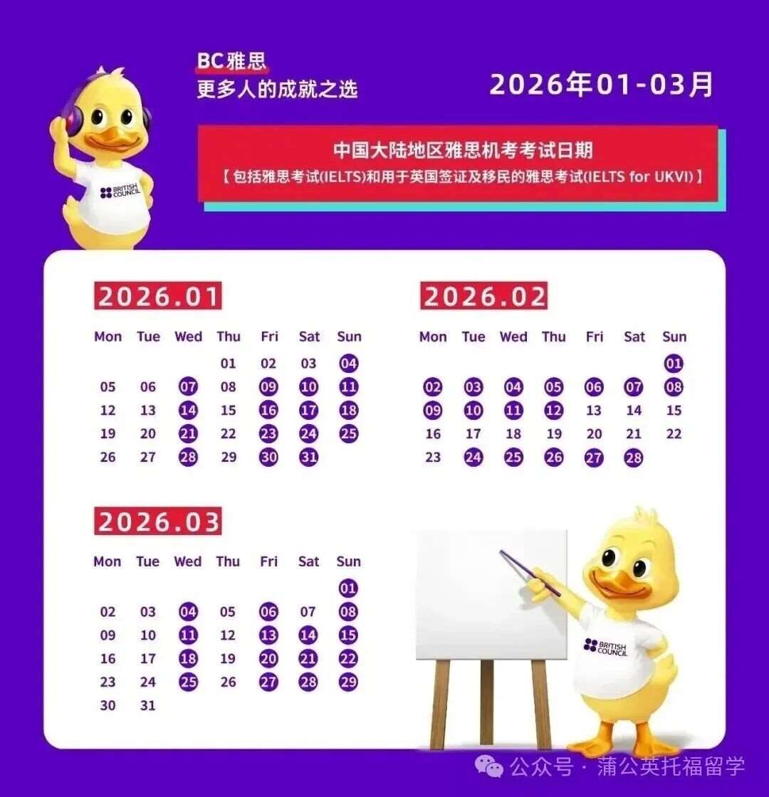 为了帮大家少走弯路、高效冲刺,上海蒲公英教育特此精心梳理了2026年上半年雅思考试全维度资讯,更量身定制了一份详尽可落地的雅思备考攻略,助力各位考生一战与雅思顺利 “分手”,奔赴理想彼岸!