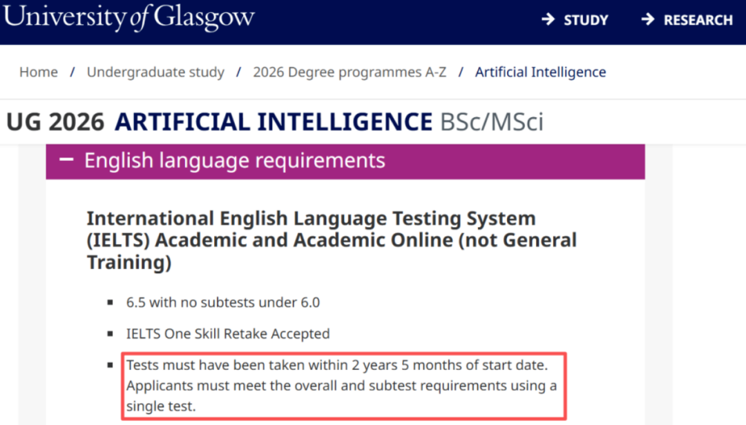 根据格拉斯哥大学官方最新通知,2026-27 学年申请季,不管是雅思、托福还是其他认可的语言考试,*有效期统一延长至 2 年零 5 个月!