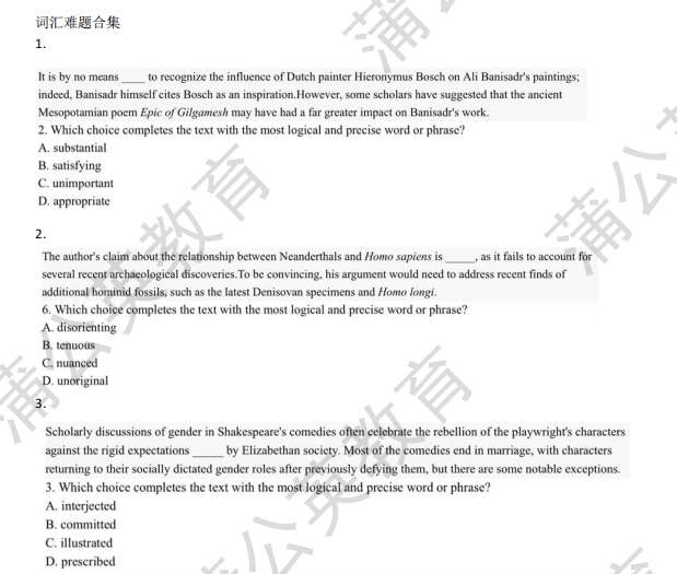 给大家准备的这份SAT词汇题难题合集是从30多套真题中“去重留精”,把所有涉及核心考点的易错题型、典型例题全部筛选出来,剔除了重复的基础题,一共45题,方便考前集中时间练习!