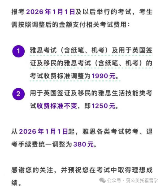 这个寒假是集中备考的黄金时段,适合用一场高效的 “短期战役”,终结漫长的雅思备考拉锯战。考位不等人,费用调整已明确,赶紧登录雅思报名官网锁定考位,结合自身情况制定备考计划,让雅思*成为你的竞争力加分项!+蒲公英小助手VX:13162172398领取雅思正课试听与雅思学习大礼包!