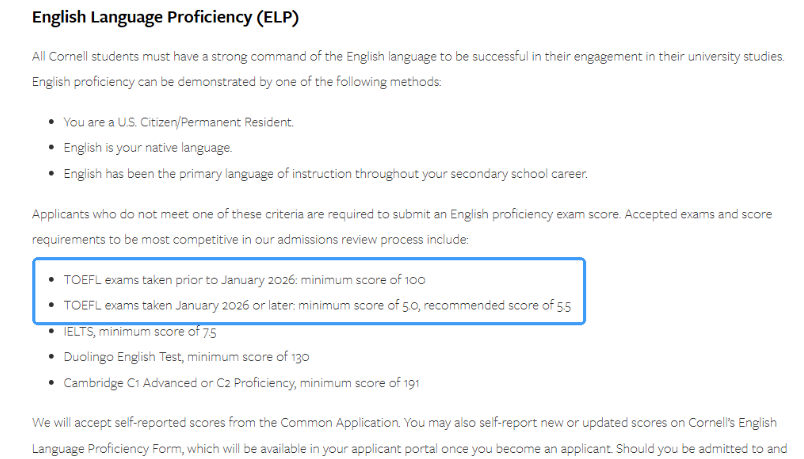 作为藤校,康奈尔对国际申请者的语言提交要求从未放松:母语非英语、且高中及之前未在全英语授课环境就读的学生,必须提交托福*。此前数年,该校一直以老托福 100 分为*低标准,此次 5.0 分,本质是适配新托福评分体系的调整,并非放宽要求。