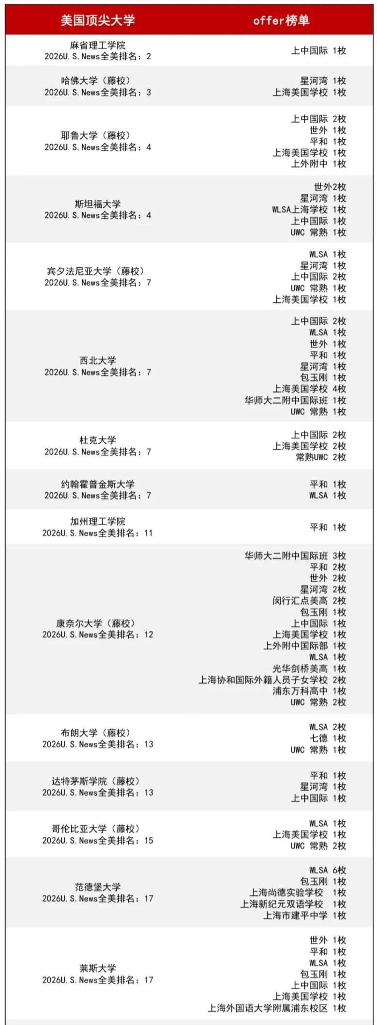 上海国际校堪称“offer收割机”——上中国际拿下麻省理工、耶鲁等校的多枚offer;WLSA上海学校在宾大、范德堡等校的录取中表现突出;上海美国学校更是在西北大学、杜克大学等校的名单里高频“刷屏”。