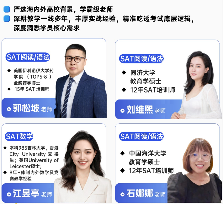 作为深耕上海国际教育领域的专业机构,蒲公英由拥有15年SAT一线教学经验的留美药学博士郭松坡创立,师资团队人均10年以上资深教师,学员多来自世外、平和、包玉刚、上中国际等沪上知名国际学校。