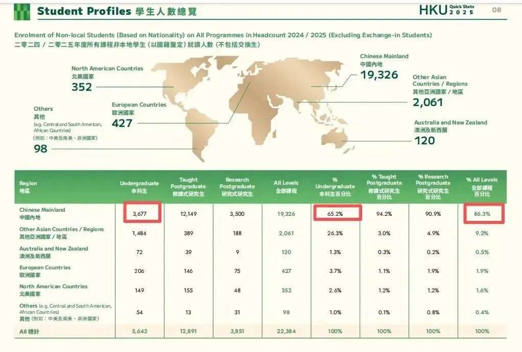 新年将至,QS亚洲香港大学《2025年度招生报告》,全面展示了学校学生总数、生源地分布及占比、内地生变化、各专业院系学生入学情况、毕业生就业等内容,信息量相当惊人。
