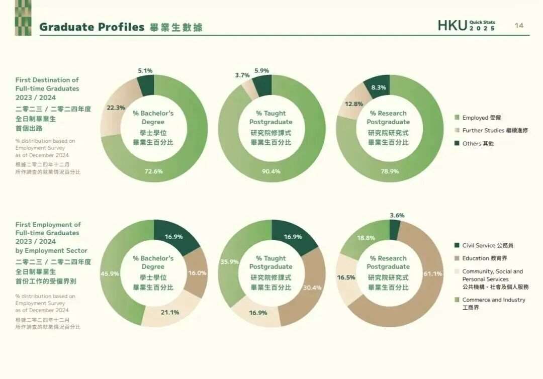 2023/2024年度香港大学全日制毕业生的就业情况呈现出清晰的学历分层特征: