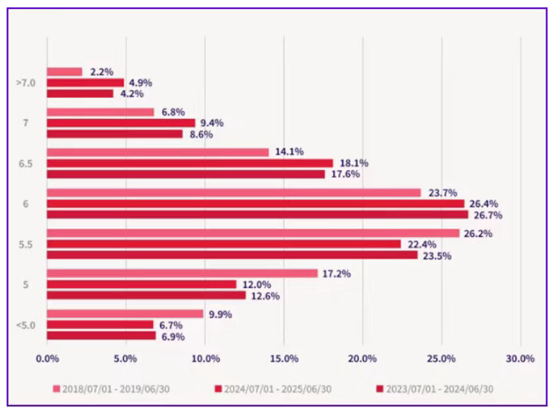 *图表:雅思学术类*各分数梯队分布(数据来源:英国文化教育协会中国大陆地区学术类雅思考生*大数据,统计周期:2024年7月1日至2025年6月30日,2023年7月1日至2024年6月30日,2018年7月1日至2019年6月30日)