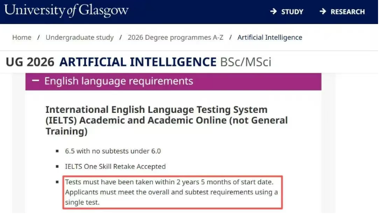 准备申请格拉斯哥大学2026学年入学的同学注意啦!近期该校更新语言*要求,将雅思考试*有效期放宽至2年零5个月。