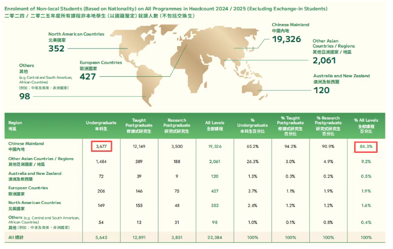 -2024/25学年,港大本科新生中内地生占比高达65.2%,非本地生群体里内地生更是以86.3%的占比稳居第*;