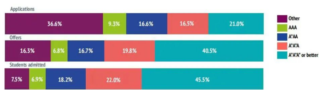 *有意思的反差:牛津全球录取生的 AAA比例三连降,2024 年跌至 45%,AAA 及以上占比 85.7%。