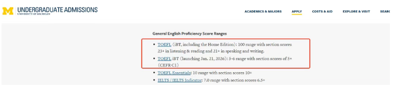 (密歇根大学安娜堡分校官网2026年新版托福*要求)