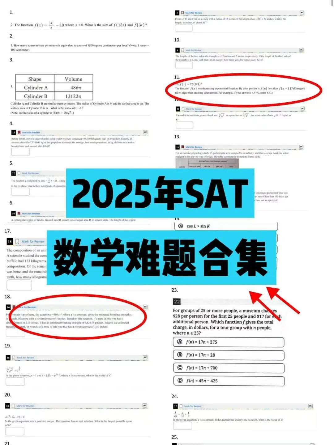 给SAT考生们带来一个:蒲公英整理了2025年SAT全年考试中的SAT数学难题真题合集,做完=25年30多套真题不用做!不用再到处找资料了!