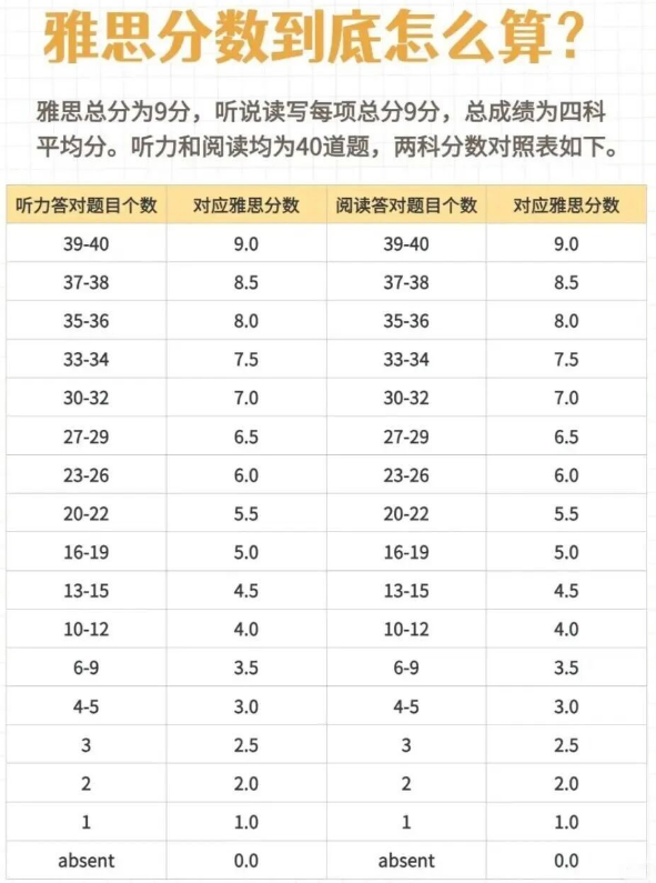 雅思总分为9分,听说读写每项总分9分,总*为四科平均分。听力和阅读均为40道题,两科分数对照表如下: