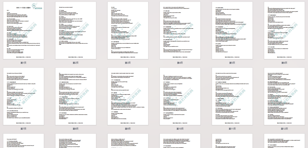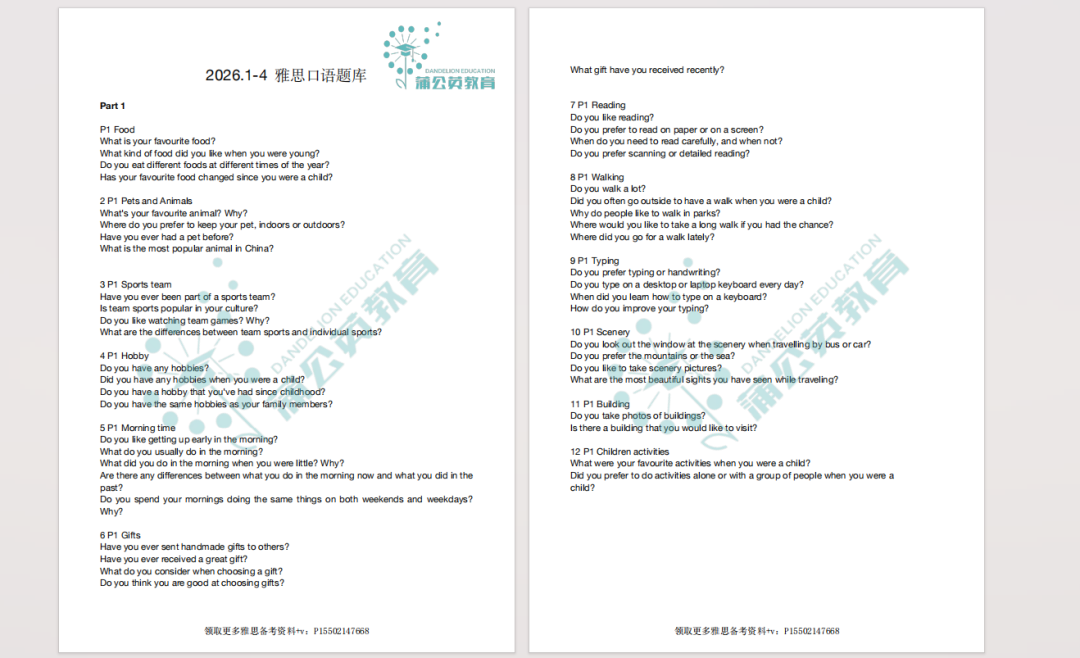 这份题库不仅全面收录了1-4月雅思口语保留题,让你无需再费心筛选过往真题;还精准涵盖了本季度的全新题目,帮你提前抢占备考先机,避*考场上遇到新题时手忙脚乱。(后续若考场上出现少量新增题目,我们也会持续为大家更新补充,确保你手中的2026年雅思考试1-4月口语题库始终保持最新状态。)