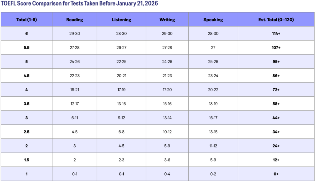 自 2026 年 1 月 21 日起,托福正式告别120 分制,切换为6 分制,分数以 0.5 分为单位递增。
