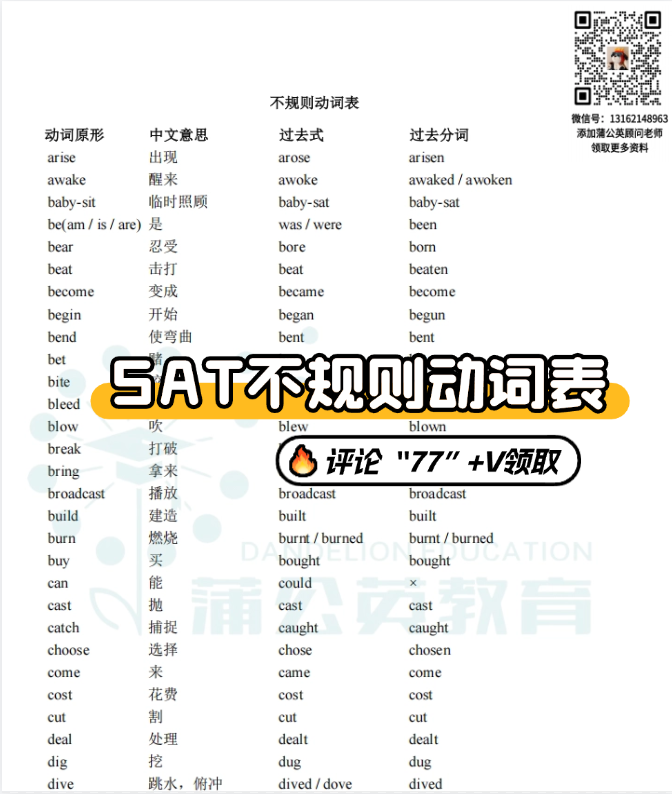 回复【英语不规则动词表】领SAT高频不规则动词表