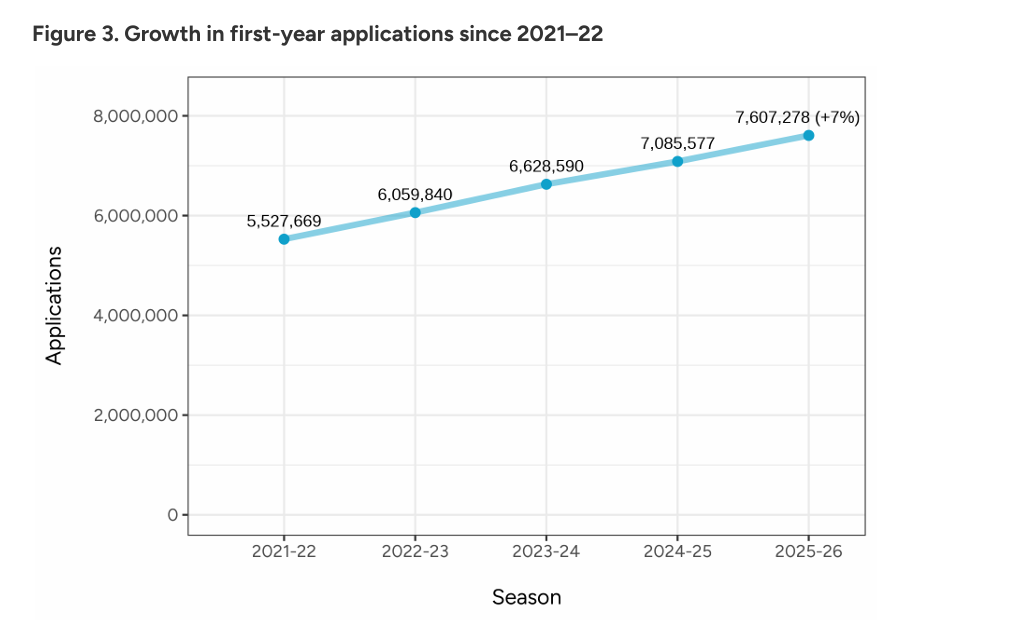 2026Fall 美本申请呈现总量攀升、人均多投的鲜明趋势:本次申请季共有1281012名申请者提交7607278份申请,申请总量同比上涨 7%;人均申请院校数达 5.94 所,较去年5.73所有所提升。这一数据背后,是录取不确定性加剧下,学生以“广撒网”策略对冲申请风险,美本申请正式迈入全面海投时代。
