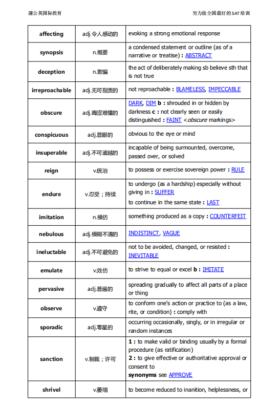 我们深知SAT词汇题(填空题)的英文释义多直接源于韦氏词典(Webster),本资料配备权威英文释义及同义词。我们建议你:第*轮用*贴切的中文意思快速建立联系;第二轮则需细细“品味”英文释义与同义词。这正是理解Sat考试高频核心词汇在真题语境中如何被考查的关键,让你不仅记住单词,更能洞悉出题逻辑。