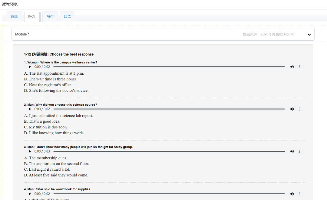 通过新托福真题模考测试,你能精准定位自己的能力层级,自适应匹配对应难度的练习内容,避免因题目过难或过易导致的备考低效,让每一次练习都贴合自身备考进度。