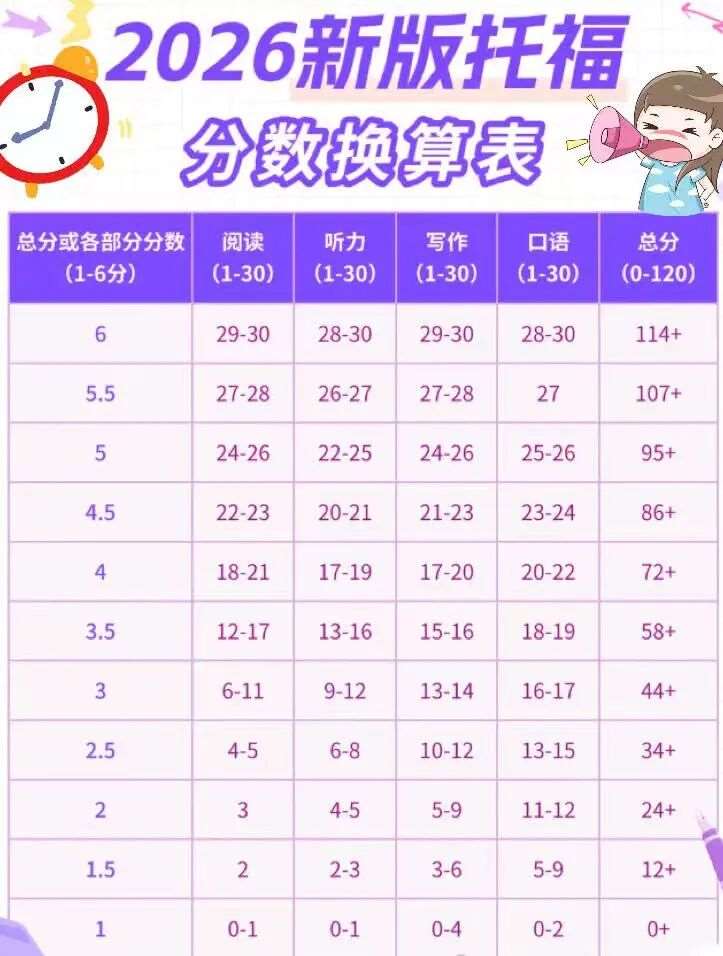 从2026年1月21日起,托福iBT考试迎来重大改革:新托福考试正式切换为“自适应模式”,除题型有所调整外,评分机制也同步优化,在原有0-120分制的基础上,新增1-6分制评分体系。