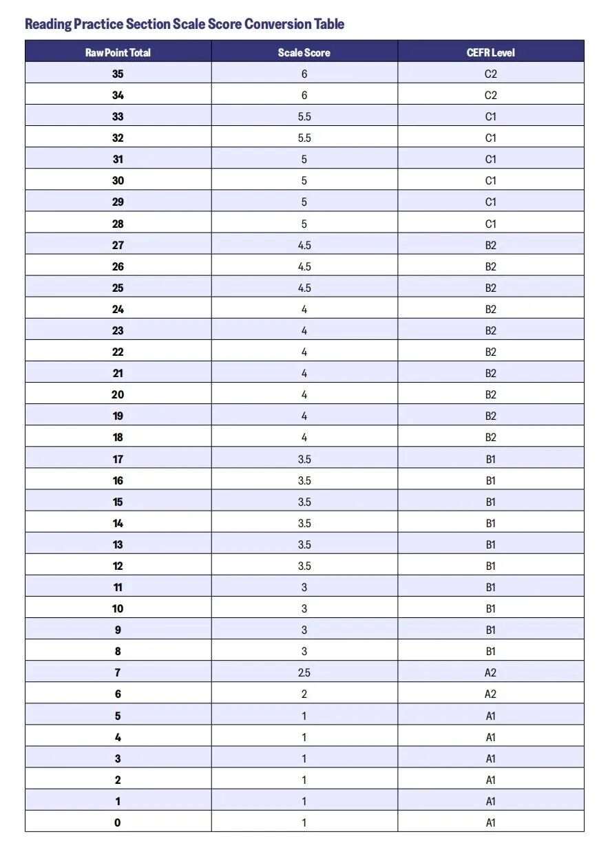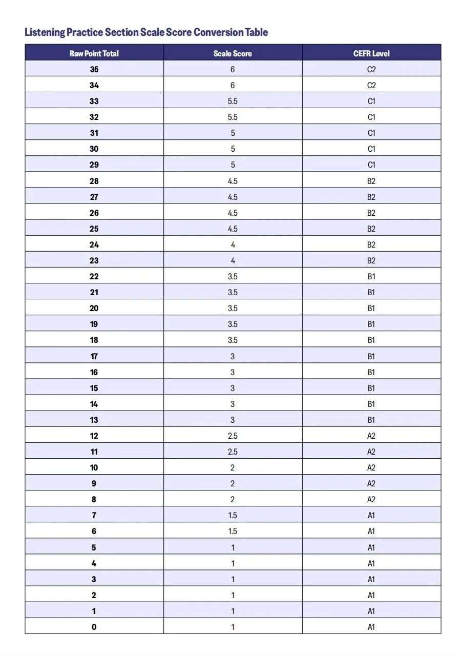 - 高分段(C1-C2):想冲刺6分(C2),阅读和听力原始分都需达到34-35分,容错率几乎为零。若目标是5分及以上(C1),阅读原始分需28分(*多错7题),听力则需31分(*多错4题),可见听力的扣分更严格。