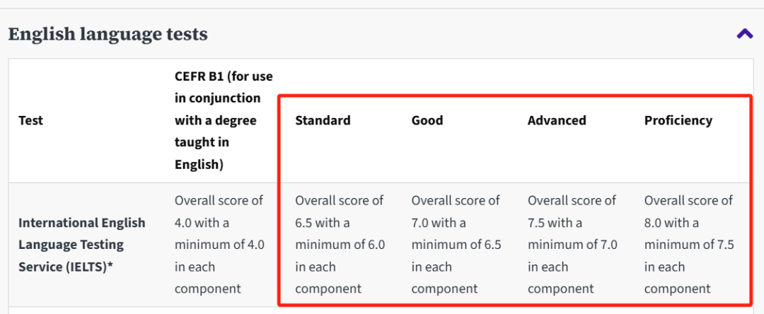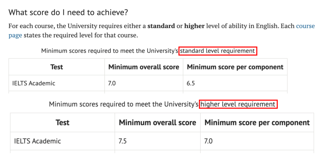 而最新英国留学雅思*要求调整后,研究生语言要求分为两个等级:Standard等级(总分7.0,单项不低于6.5)和Higher等级(总分7.5,单项不低于7.0)