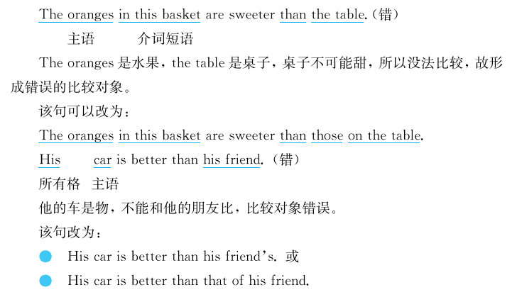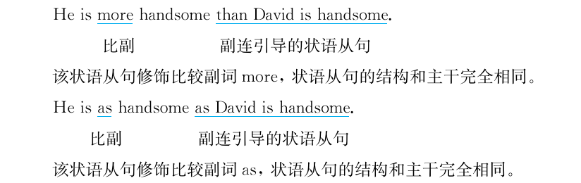 比较结构里*常见的两个副词连接词是than和as,因此它们后面连接的是与主干结构完全相同的状语从句。 该状语从句修饰比较副词as,状语从句的结构和主干完全相同。一般比较结构,指的是使用副词连接词than引导的比较结构。 比较结构的省略在该比较结构中,状语从句的结构一般和主干完全相同,但为了使句式更简洁,避免重复,往往仅保留比较对象,其它部分均可以省略。比较结构的省略对中国学生来说,往往是一大难点。He is more handsome than David is handsome. = He is more handsome than David.Than引导的状语从句中,若有be动词,情态动词(can、will、shall、should等),助动词(have, has等),这些动词都可以保留。若为一般行为动词,则这些动词用助动词do的各种变体来代替。当然,所有的动词都可以省略。He is less intelligent than you (are).He can work more carefully than you (can).He sang more harmonically than you (did). 课堂练习.About the closest any research has come to supporting the tiredness theory is to confirm that adults yawn more often on weekdays than at weekends, and that school children yawn more frequently in their first year at primary school than they do in kindergarten.比较结构的对象 比较结构中通常对象是不同的人或物,对比较对象的判断往往是中国学生比较难以把握的难点。1)比较的对象可以是自己。She looks more beautiful than she is. 她看起来比实际年轻。2)比较的对象可以是过去的自己,如果时态不同,则than引导的从句的主语及后面的be动词、情态动词、和助动词不可省略。He is healthier than he was.他比以前健康。She can dance better than she could. 他比从前舞蹈跳得好。He works harder than he did. 他比以前更努力。课堂练习.About the closest any research has come to supporting the tiredness theory is to confirm that adults yawn more often on weekdays than at weekends, and that school children yawn more frequently in their first year at primary school than they do in kindergarten.3)在自行比较结构中,若主句及than从句中均有对等的介词短语,than之后的主语及动词或助动词可以省略。He is happier with Mary than he is (happy) with Rose. = He is happier with Mary than with Rose.He is more interested in English than he is (interested) in French.=He is more interested in English than in French.课堂练习A population of oaks is likely to be relatively stable through time, and its survival is likely to depend more on its ability to withstand the pressures of competition or predation than on its ability to take advantage of chance events.注意:介词短语对称时,第二个短语的介词千万不可省略,否则会造成对象的错误比较。He is more interested in English than French. (错)他和法语不能比较。4)在自行比较结构中,than从句中由另一个when引导的状语从句修饰时,than之后的主语及动词或助动词可以省略。He is much taller than he was when I saw him ten years ago. = He is much taller than when I saw him ten years ago.课堂练习Seldom is the weather more dramatic than when thunderstorms strike.5)“主语 + 介词短语”或“所有格 + 主语”极易形成对象的错误比较,应该注意避免。课堂练习The tradition of religious sculpture extends over most historical periods but is less clearly delineated than that of stonewares or porcelains, for it embraces the old custom of earthenware burial ceramics with later religious images and architectural ornament.注意同范围及不同范围的比较同范围某人或物属于同一团体或种类,如果要将之与该团体或种类的其它所有分子作比较时,采用下列句型,以避免将该人或物形成重叠比较:John is better than any other student/all the other students/all the others /anyone else in his class. John比他班上的其他同学优秀。Shanghai is bigger than any other city/ all the other cities in China.上海比中国其它城市要大。不同范围如果做不同范围的比较时,则不需要加other一词。John is better than any student/all the students/all the others /anyone in Rose’s class.Shanghai is bigger than any city/ all the cities in USA.比较结构的简化比较结构中,若主句的谓语动词和从句的谓语动词相同时,从句中的动词可以改为do、does、did等助动词。I love you than he loves you. = I love you than he does you.注意:I love you than Rose. 这句话有两个意思,可以看作I和Rose比:I love you than Rose loves you. (我比Rose更爱你。)也可以看作you和Rose比:I love you than I love Rose. (我爱你比爱Rose更多。)因此,这两句可以分别改为:I love you than Rose loves you. = I love you than Rose does.(does不能省)I love you than I love Rose. = I love you than I do Rose.课堂练习.About the closest any research has come to supporting the tiredness theory is to confirm that adults yawn more often on weekdays than at weekends, and that school children yawn more frequently in their first year at primary school than they do in kindergarten.本身具有*高意义的形容词有些形容词或副词,本身就有“至极”或“*高级”的意味,则不能使用在比较级结构中。比如:perfect(完美的),sublime(卓越的),noble(高贵的),extreme(极度的),superb(极好的),excellent(特优的)等。I speak English more perfectly than David.(错)Perfectly已经“完美无缺”了,故无比较级。本身具有*高意义的形容词某些-ior结尾的形容词本身具有比较级的味道,不需要用“more…than…”或“less…than…”修饰,而要与介词to连用。比如:Be superior to比…优越的Be inferior to比…差的Be senior to比…地位高的Be junior to比…地位低的Even though He is superior to his other classmates, he is not arrogant.Rose is senior to her boyfriend in the company
