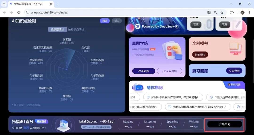 托福官方AI 学练平台查到的分数同样来自ETS官方数据源,除了真题学练、智能批改外,它也可以作为官方*查询入口。