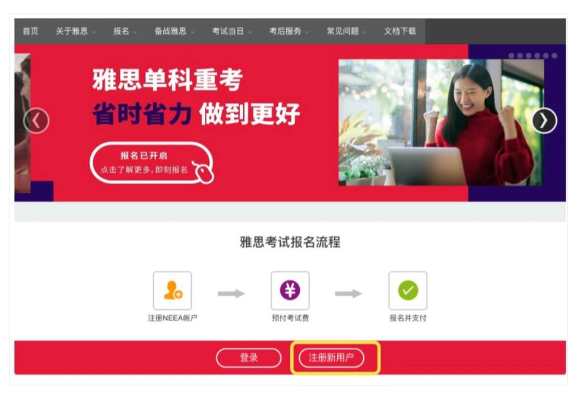 进入教育部考试中心雅思报名网站,点击“立即注册”。