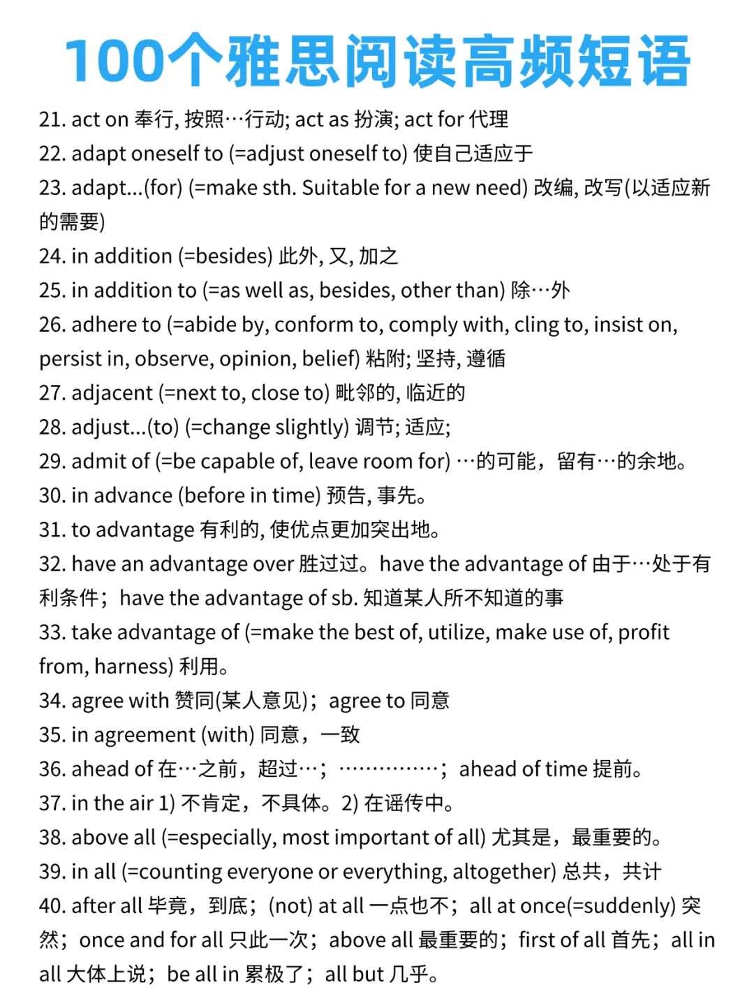 今天给大家分享100个雅思阅读高频短语,这份资料里的短语大多来自来自雅思历年真题,覆盖考试中常见的固定搭配和逻辑表达。