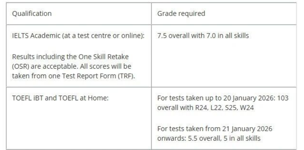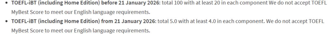 2026 年 1 月 21 日前托福:总分不低于 100 分,单项不低于 20 分。 2026 年 1 月 21 日后新托福:总分不低于 5.0 分,单项不低于 4.0 分。