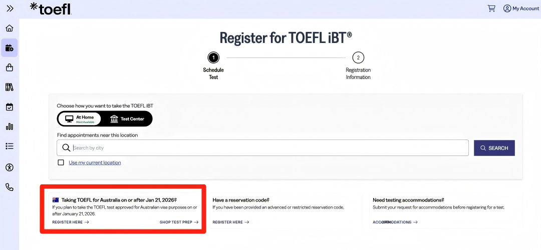 3. 在页面中选择“Taking TOEFL for Australia on or after Jan 21, 2026?”