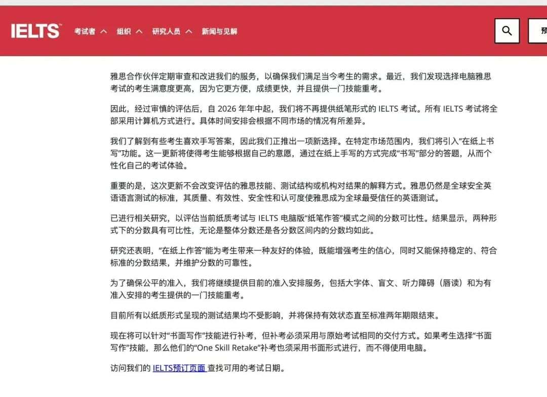 面对突如其来的改革,很多考生陷入焦虑,担心考试难度飙升、*认可度下降。其实大家大可放宽心,此次改革只是考试形式的更迭,雅思考试的核心内核丝毫未变。无论是考查的语言能力、题型结构,还是院校*认可度、评分标准,都与此前保持一致,机考与纸笔考*具备同等效力,完全不影响留学、移民等各类申请。更贴心的是,官方考虑到部分考生手写答题的习惯,在指定考区推出“Writing on Paper”新选项,机考考生可自主选择写作部分纸笔作答。(但要注意,初试选定手写模式,后续单科重考也需保持一致,不能随意切换)。同时,雅思官方发布全球取消纸笔考的通知中明确:过往纸笔考*在2年有效期内依旧有效,无障碍考务安排也会持续保留,全方位保障考生权益。其实雅思全面机考并非临时起意,早在2024年,马来西亚就率先取消雅思纸笔考,随后越南、孟加拉、中国台湾、约旦、韩国等多个地区纷纷跟进,全面迈入机考时代。官方调研数据显示,雅思机考凭借场次灵活、出分快(3-5天出分)、支持单科重考等优势,考生满意度远超纸笔考,这也是雅思官方发布全球取消纸笔考的核心原因。British Council已开放2026年4-6月纸笔考考位,目前仅剩7场,习惯手写答题、已按纸笔模式备考的考生,一定要抓住这波末班车,错过就只能彻底转战机考。2026年雅思机考全面落地,考生面临的雅思痛点愈发突出:即便雅思官方发布全球取消纸笔考已成定局,很多考生依旧手足无措,不知道如何适配新考试模式。- 日常练习优先使用戴尔键盘,佩戴头戴式耳机熟悉听力环境;