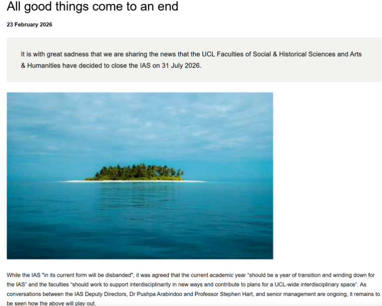近期,英国留学圈突然炸出一条重磅消息 ——伦敦大学学院UCL正式官宣:运营十年的高等研究院(IAS),将于今年 7 月 31 日正式关闭。