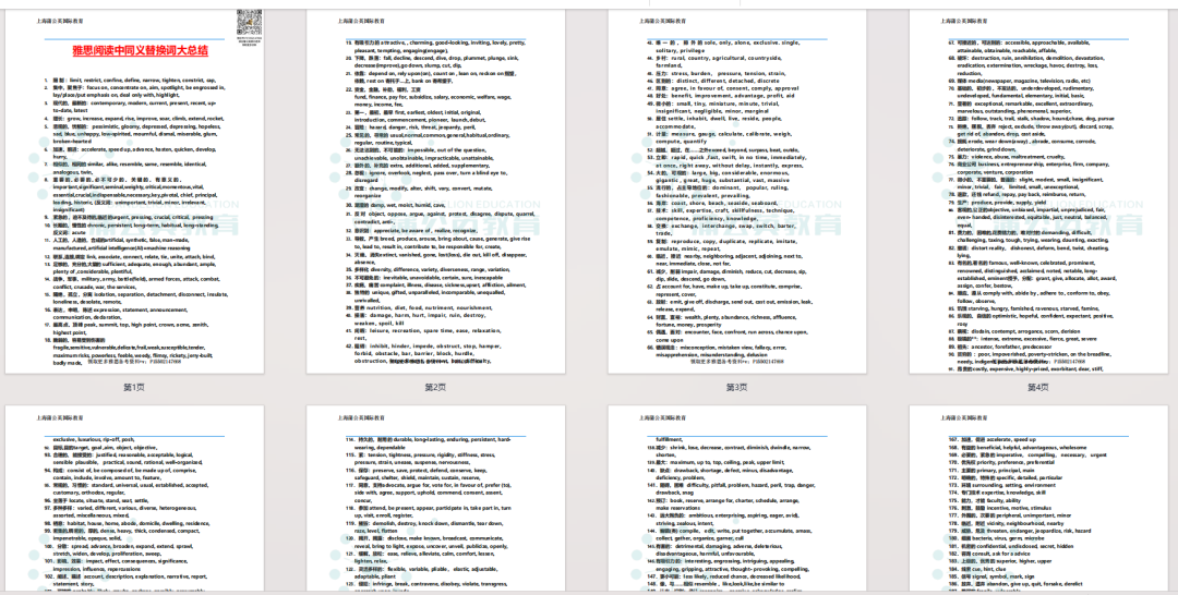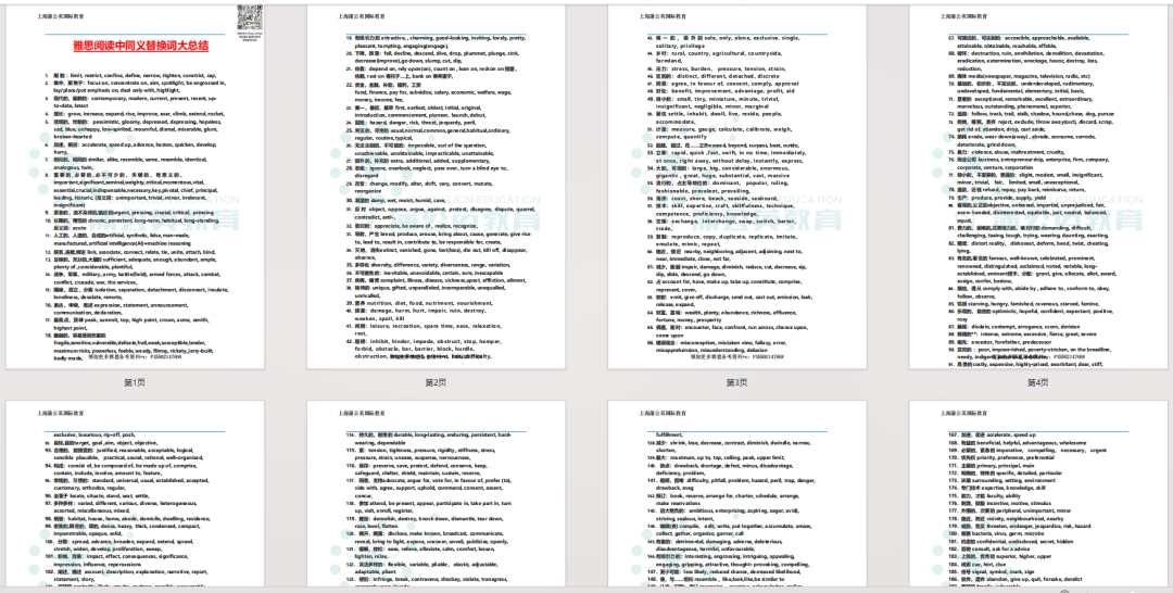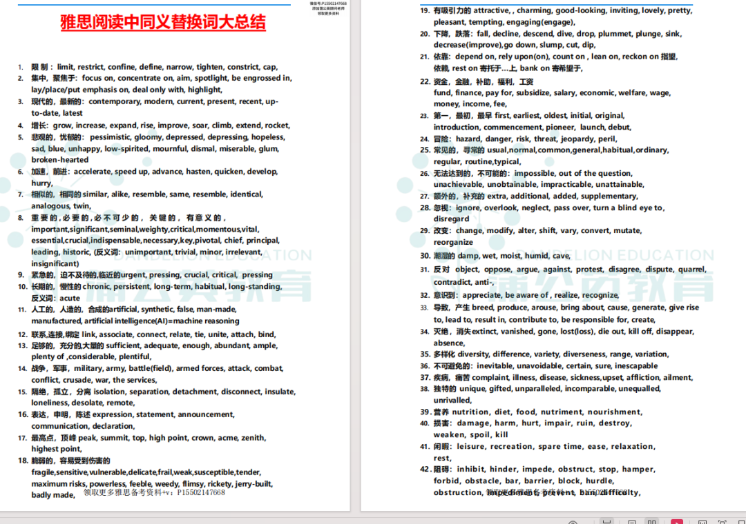 先给大家放出资料里的核心高频词群,都是阅读、听力里的常考内容,提前码住背起来,做好雅思同义词替换单词备考,做题立马能感受到差距: