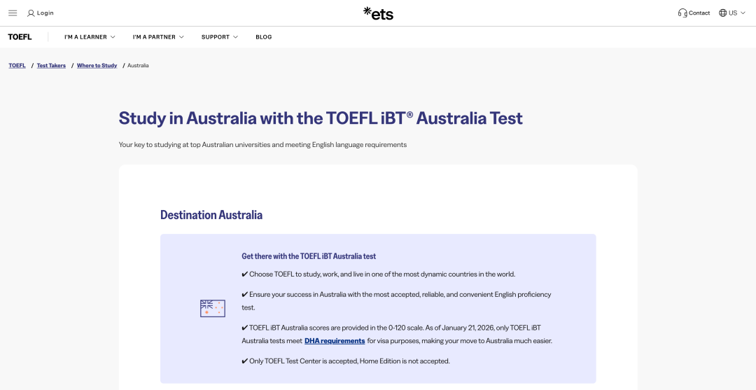 该考试沿用0-120分传统评分体系,*可全面满足澳大利亚签证的英语语言要求,同时适配澳洲所有院校的入学审核标准,确保*被广泛认可。考生可访问ETS官网,查询该考试的报考流程、考点信息等更多详情。