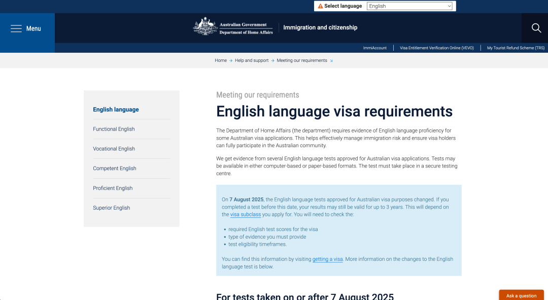 考生可登录澳大利亚内政事务部官方网站了解澳大利亚签证英语语言要求的最新信息。