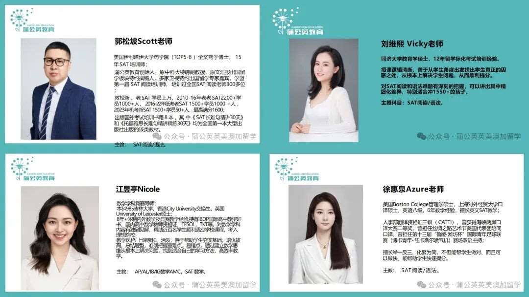蒲公英教育SAT项目组目前合计共有5位老师:3名海龟:1名美国博士,2名英美港硕士;2名国内知名高校硕士;硕士及以上学历;60%老师10年以上教学经验。