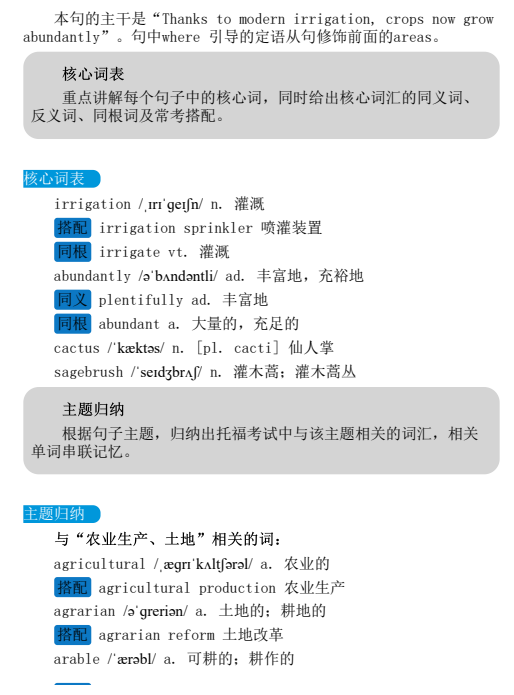 重点讲解每个句子中的核心词;同时给出核心词汇的同义词、反义词、同根词及常考搭配;归纳与句子主题相关的考试词汇。通过以上主题式归纳的办法,考生学完100个句子的同时也把7000个考试相关词汇牢牢记在脑中。