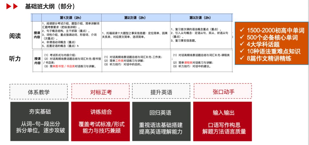 2. 后期冲刺阶段,针对听力、阅读、口语、写作四大模块进行重点强化训练,传授考试技巧。
