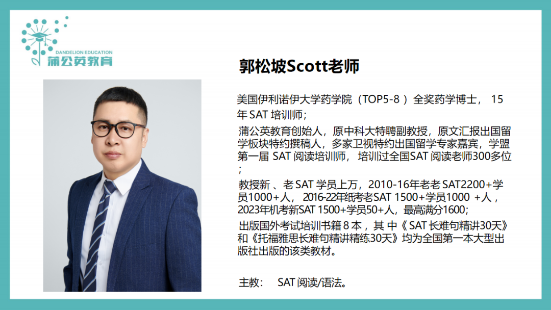 ✅ 留美郭博士,也就是上海蒲公英的创始人郭松坡博士,毕业于美国伊利诺伊大学的全药学博士,还是原中国科技大学特聘副教授,文汇报出国留学专栏特聘撰稿人。出版的出国考试类书籍就有8本之多,有15年SAT培训经验,从2009年就开始从事出国留学教育啦,还是全国学盟第一届SAT培训师✨。深谙最新SAT考试套路,从SAT考试出题逻辑到答题技巧全盘拆解,SAT备考干货多到记不完!