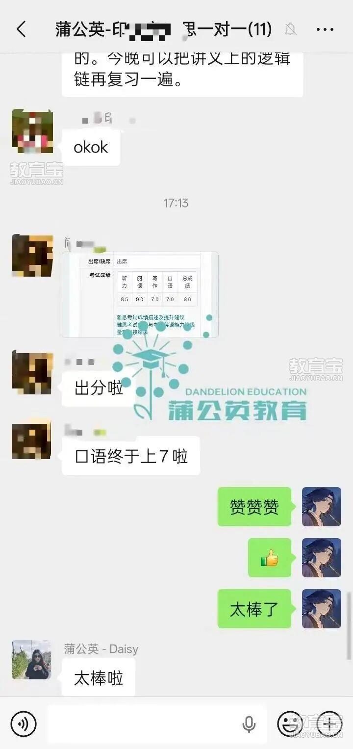 上海蒲公英国际教育独创逻辑链口语写作方法,帮学生快速解决思维以及语言问题,辅助设计了句式多样性以及精准化语法在有效的教学管理体系下,经过150小时的培训,雅思大概进步1-1.5分。
